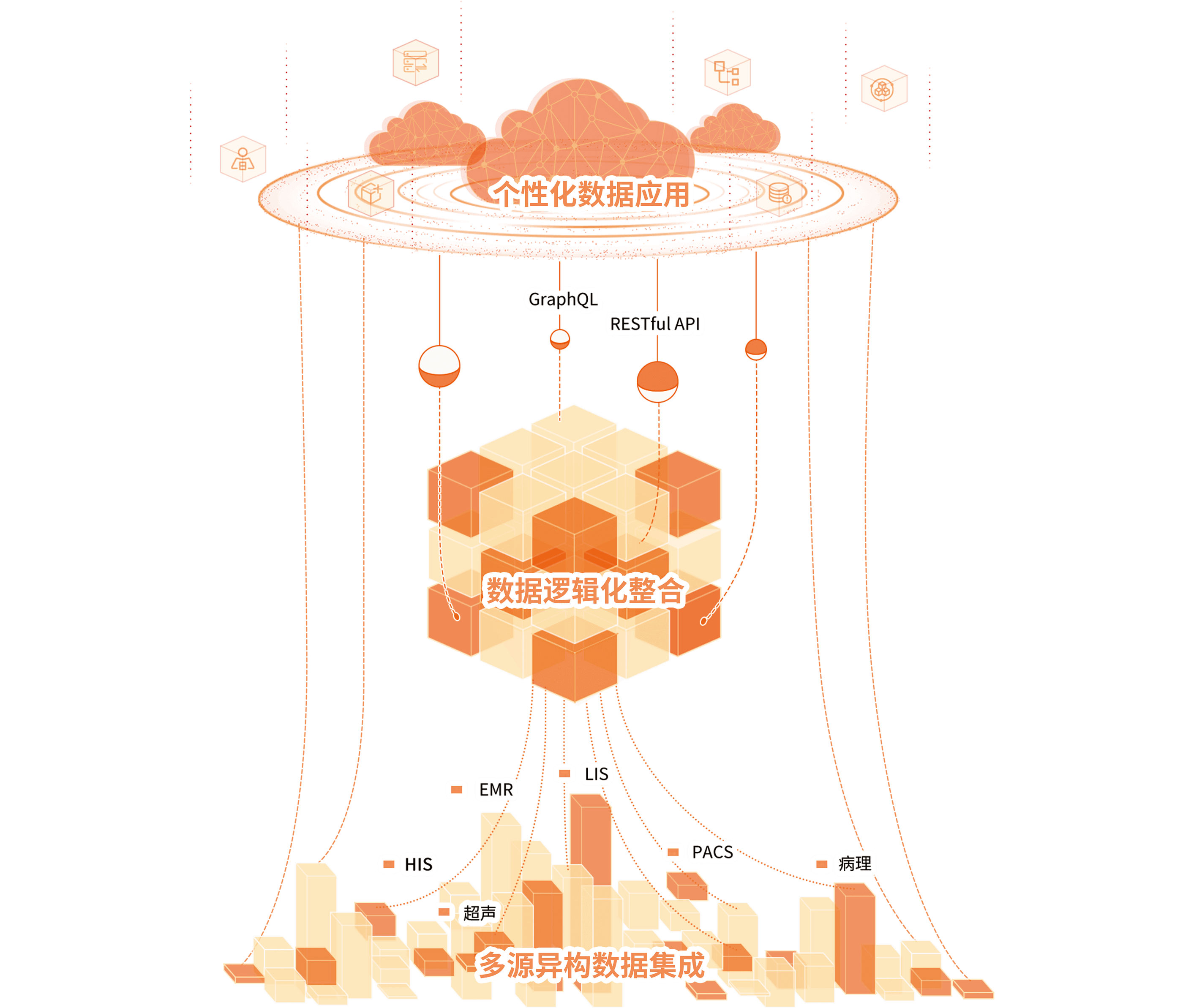 醫(yī)眾醫(yī)療數(shù)據(jù)服務(wù)采用 Data Fabric 數(shù)據(jù)編織的架構(gòu)理念,幫助用戶應(yīng)對(duì)在數(shù)據(jù)資產(chǎn)化進(jìn)程中產(chǎn)生的復(fù)雜性、分布式、多元化等因素,從單純的以數(shù)據(jù)應(yīng)用為核心建設(shè)數(shù)字化,向體系化的數(shù)據(jù)服務(wù)能力建設(shè)轉(zhuǎn)型。